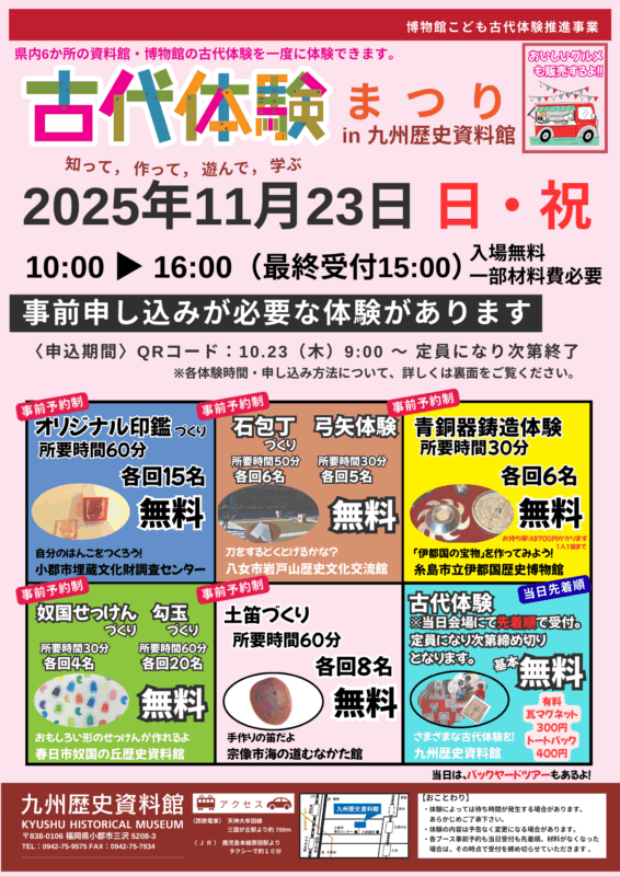 バックヤードツアーや古墳VR、土器パズルに竪穴住居体験、古代衣装着付け、発掘体験、瓦マグネット(有料300円)、装飾古墳トートバックづくり(有料400円)など。