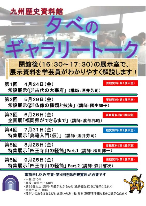 会場は当館1階 第1展示室(第4回のみ第2展示室 入館料不要)です。事前申し込みは不要ですが、第1展示室への入館料が必要となります。