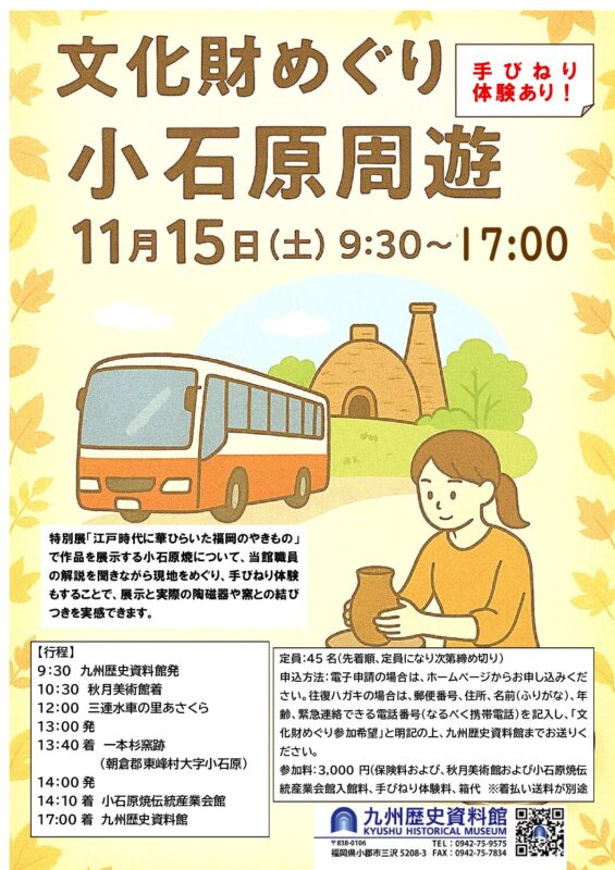 コース:九州歴史資料館 出発 ⇒ 秋月美術館 ⇒ 三連水車の里あさくら ⇒ 一本杉窯跡 ⇒ 小石原焼伝統産業会館(手びねり体験)⇒ 道の駅小石原 ⇒ 九州歴史資料館 着