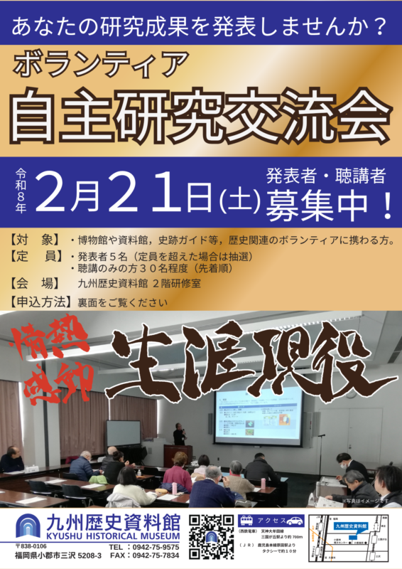 ⾃主的な歴史の研究や調査を⾏っている九歴ボランティア、その他博物館、資料館や史跡ガイド等の歴史のボランティアに携わる方で⾃主的に歴史の研究や調査をされている方による研究交流会です。歴史について共に学び合いませんか。