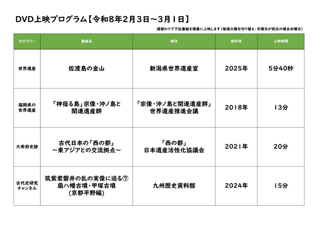令和8年2月2月3日~3月1日の上映は開催中のパネル展世界遺産「佐渡島の金山」「『神宿る島』宗像・沖ノ島と関連遺産群」、古代史研究チャンネル第7篇 「筑紫君磐井の実像に迫る⑦ 扇八幡古墳・甲塚古墳(京都平野編)」などを予定しています。