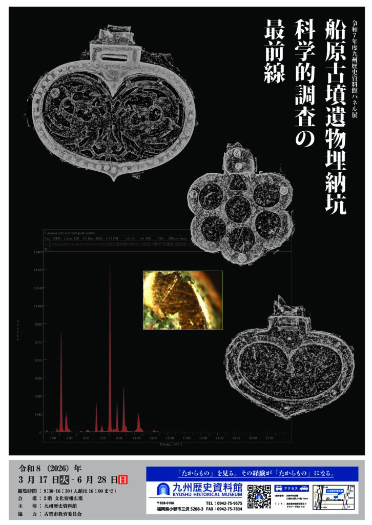 令和7年度は、蛍光X線分析及びX線透過撮影による調査を実施しました。これら非破壊調査により、出土遺物の材質技法などに関する新たな知見が得られつつあります。本展では、科学的調査の成果や保存処理によって明らかとなった最新の研究成果をパネルにてご紹介します。